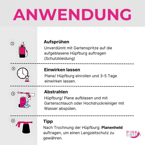 ✅ EINFACH ANZUWENDEN: Aufgeblasene Hüpfburg einsprühen. Einrollen und 3-5 Tage eingerollt lassen. Aufblasen und mit Gartenschlauch abspritzen – Fertig!