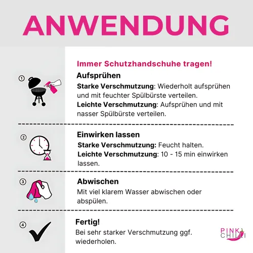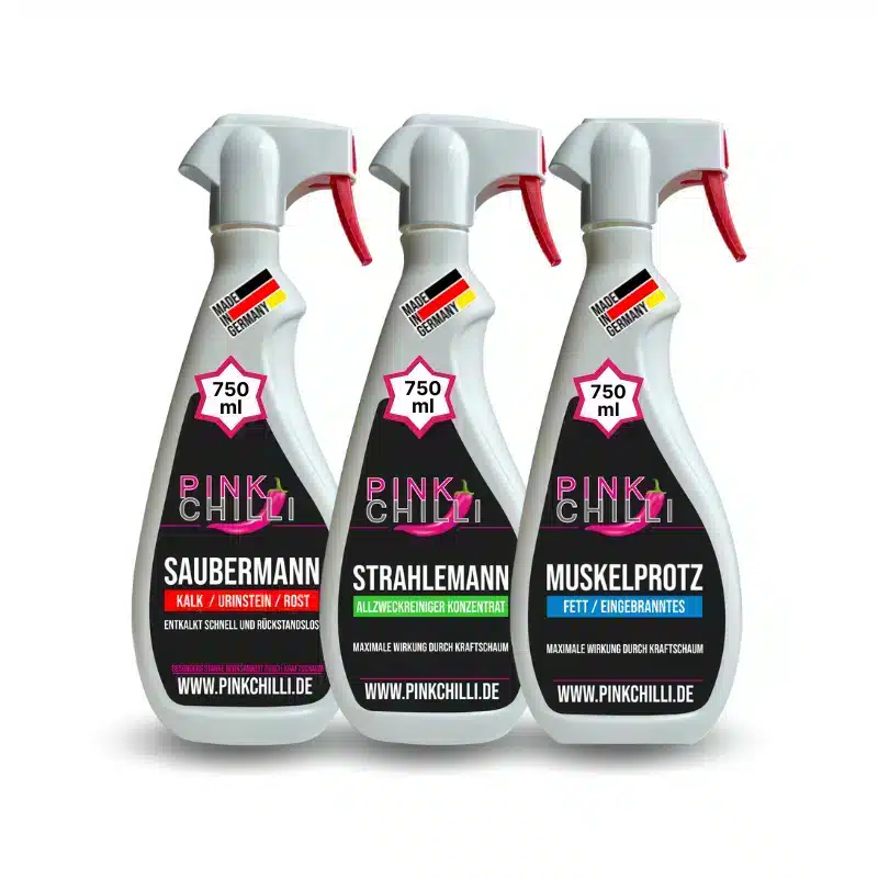 Bei starken Verschmutzungen: den Muskelprotz alle 15 Minuten auf die zu behandelnde Fläche sprühen und mit einer Spülbürste verteilen. Ggfs. nach der ersten Anwendung z. B. mit einer Klarsichtfolie abdecken. Dies verhindert das Austrocknen und kann die Einwirkzeit deutlich verlängern. Anschließend die Fläche mit klarem Wasser von unserem Wundermittel befreien. Hinterher mit einem Tuch abtrocknen. Fertig.