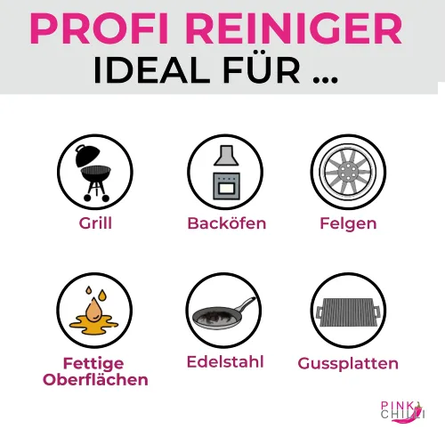 Der Reiniger kann für emaillierte Blech- und Gussroste, Edelstahlroste, emaillierte Gussplatten, sowie Grillpfannen aus Edelstahl, Öfen, Werkzeuge und Felgen verwendet werden.