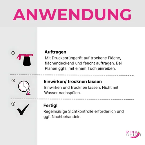 Bei Planen: Den Planenheld unverdünnt auf die zu behandelnde Fläche mit einem Tuch gleichmäßig bis in jede Ecke auftragen, danach eintrocknen lassen und nicht abspülen! Dabei für gute Belüftung sorgen. Fertig. Regelmäßige Sichtkontrolle und Nachbehandlung nach Bedarf erforderlich.
