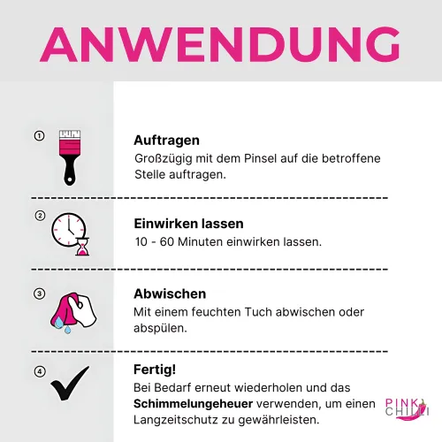 Trage die Schimmelbestie großzügig mit Pinsel oder Schwamm auf die betroffene Stelle auf und lasse sie für etwa 10-15 Minuten einwirken. Anschließend die Fläche gut abspülen oder mit einem nassen Tuch abwischen. Wenn du schwer zugängliche Stellen reinigen möchtest, empfehlen wir dir die Verwendung einer Bürste. Auf Silikonfugen kann eine Wiederholung der Anwendung nötig sein. Die Schimmelbestie ist einfach anzuwenden und wirkt schnell, um Schimmelbefall zu beseitigen.