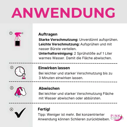 Bei geringer Verschmutzung und zur Unterhaltsreinigung: Erstellen Sie sich einfach eine Reinigungslösung mit ca. 10 Sprühstößen auf 5 Liter warmes Wasser. Danach die Fläche mit der Reinigungslösung abwischen. -Perfekt zum Fensterputzen und zur Bodenpflege- Fertig.